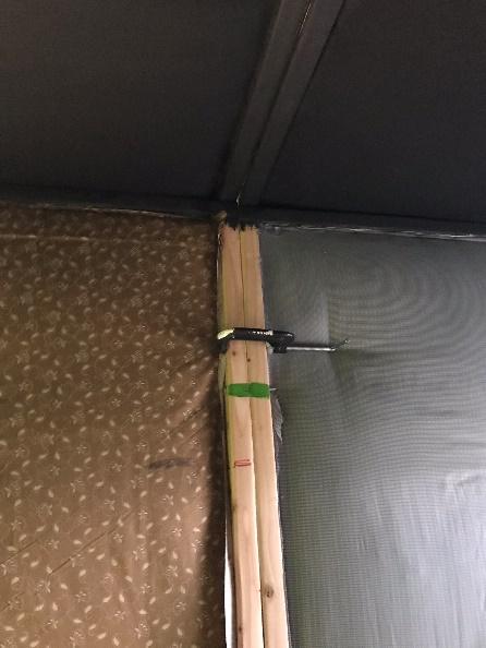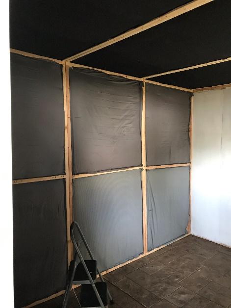 I decided to cover all the fiberglass with fabric but this cost wasn’t in my initial budget of $1300.00. The cheapest fabric I could find at the local big box store was still around $3.50 per square yard and I had a lot of walls to cover. However, that same store sold twin sized flat bed sheets for $4.95, substantially below the raw fabric cost. I used black sheets to cover the inside of the roof panels since they would be visible after final completion. But their stock was limited so some of the other panels were covered in some tacky looking patterns, but since they would ultimately be covered by the carpeting, it didn’t matter. The fabric was attached with staples and to the inner side of the wood frame. This left the joints exposed, which was important for the next steps. The exception to this was the back wall which would be covered with high grade, finished plywood veneer so I would have a smooth, finished surface to use as a green screen for video recording.