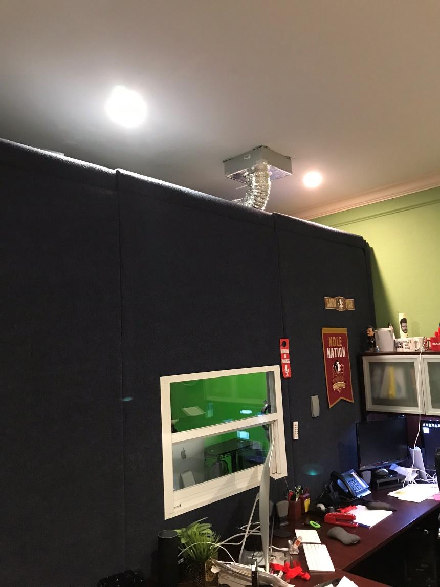 I live in Florida, so air conditioning was of great importance. But if you live in a colder climate and plan to duct a furnace into your sound booth, this can be problematic for several reasons. The first is that it may not be possible (or safe) to use flexible duct to connect to a furnace. Most homes use rigid sheet metal ducts for this sort of heat. The only thing this type of ductwork does better than carrying heat is carrying sound. There are ways to create a baffle to mitigate the sound but it’s complicated so if you can avoid this sort of ducting, I highly recommend doing so for multiple reasons.