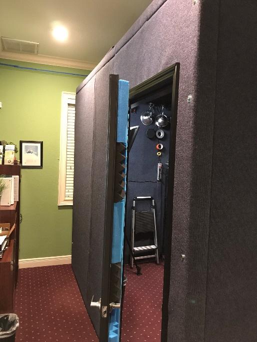 With all the carpeting in place, I transported all the panels to my office for final re-assembly. This step was a bit more challenging than the initial build because there was less room to maneuver and I only had access to two of the four sides. I originally built the room in a large screened porch at my house and was able to access all sides. Since my office has ten foot ceilings, there was just enough room on top to access the air duct and even store some file boxes and assorted junk. After all, my once spacious office was now a bit cramped on account of the giant sound booth now occupying almost half of it.